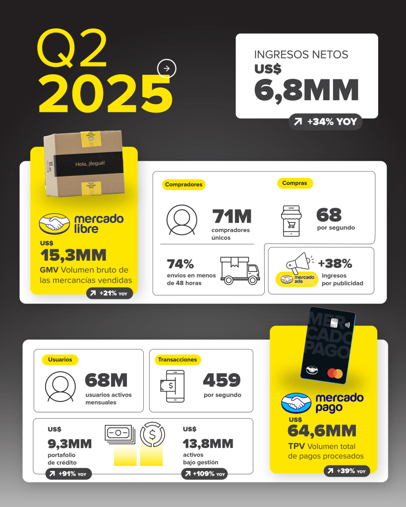Mercado Libre, la principal plataforma de comercio electrónico y servicios financieros de América Latina, anunció hoy sus resultados financieros del segundo trimestre de 2025, manteniendo un fuerte ritmo de crecimiento con ingresos netos de US$ 6,8 mil millones, lo que representa un aumento del 34% interanual. Tanto el comercio como las fintech mantuvieron un fuerte impulso y tasas de crecimiento.